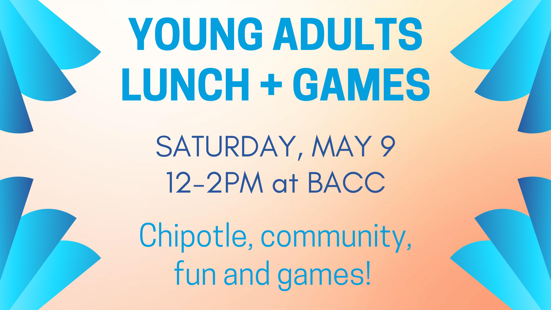 Our next community event is on Saturday, May 9th from 12-2pm at the church. We'll have Chipotle catering, and hang out together while playing fun indoor and outdoor games! We'd love to see you there. Click Here to Register if you're planning to attend!